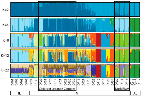 The estimated best K based on Evanno et al. [25] was determined to be K = 2, whereas the best K based on Pritchard et al. [26] was K = 22. Due to the similarity among values of K between 2 and 22, we chose to present the output for selected values of K (2, 4, 8, 12, and 22) that reflect the range of structure observed (Figure 3). Based on this output, the three geographic regions form distinct clusters (each designated with a distinct color), with no real structure observed among populations within Illinois or among populations within Alabama. Within Tennessee, similarity among populations within the Cedars of Lebanon Complex can be seen, and similarity among populations within the Duck River Complex can be seen. Other populations that are more geographically distinct appear to form distinct clusters. To further illustrate what we view to be the most biologically meaningful representation of these data, a more detailed map view of sampling locations as they relate to the STRUCTURE output for K = 12 is shown in Figure 4, where clusters can be clearly separated by the geographic distance between populations.