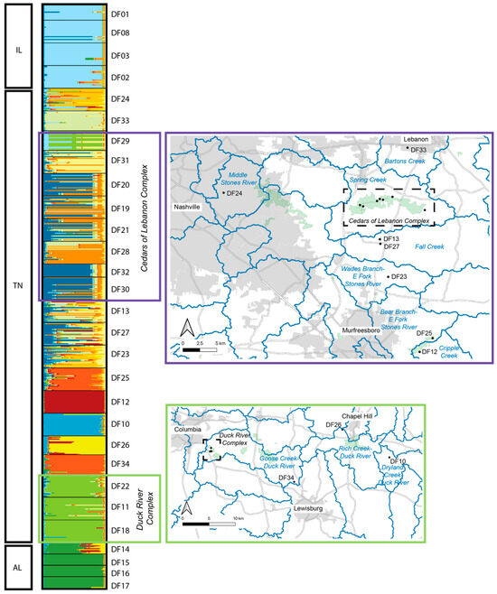 In Tennessee, there are at least 20 EOs, as defined by NatureServe protocols [16], included in the present genetic dataset. Based on the combined analyses presented here, only a subset of these represent distinct genetic clusters, or populations. For example, the majority of EOs within the Cedars of Lebanon Complex appear to be functioning as a single population, with either continuous modern-day gene flow among them or a past signature of connectivity that no longer exists. According to pairwise population FST values (Supplemental Table S3), the sampled sites within the Cedars of Lebanon Complex are as similar to each other as the sampled sites within the Illinois complex. Additionally, sites within the Cedars of Lebanon Complex are consistently more similar to each other than are other Tennessee sites within close geographic proximity to each other (e.g., Duck River Complex). The sites within the Cedars of Lebanon Complex are in relatively close proximity to each other, with distances between most neighboring sites ranging between 0.5 km and 2 km, with the greatest distance between neighboring sites being approximately 5 km. Some of the highest levels of genetic diversity observed within Tennessee are found in sites just 7 km (DF13 and DF27) and 14 km (DF23) south of the Cedars of Lebanon Complex (Table 2, Figure 3 and Figure 4). A portion of this area south of Cedars (DF13 and DF27) is known as Lane Farm, which interestingly shows some genetic similarity to Illinois sites (Supplemental Table S3). Additionally, Lane Farm shows genetic similarity to other sites across Tennessee (DF11, DF25, and DF33), which could suggest that Lane Farm represents a historic genetic source population for the species. However, we acknowledge that additional genetic resolution could change our interpretation of these results, and more data are needed to further support this idea.