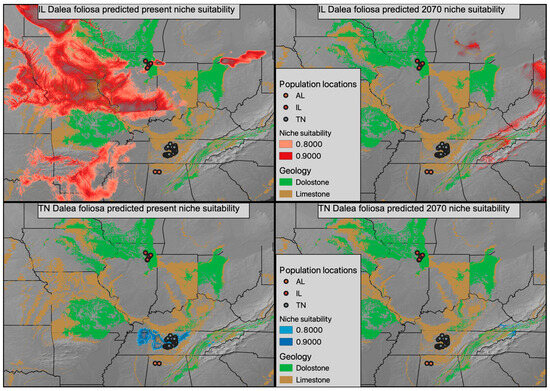 As a narrow endemic, ecological models of Dalea foliosa must come with a substantial caveat. Specifically, D. foliosa likely has very specific microhabitat requirements, which could include shallow topsoil and flooding frequency [35,36,37], that are not reflected in broad global models. Therefore, the models we discuss here are better interpreted as predicted suitable climatic conditions and their intersection with the limestone and dolomite geology that defines the glades this species inhabits. Based on both the present and predicted future climatic models, it appears that by 2070, following a moderate climate change scenario, limestone/dolomite geology will only intersect with a modest region of climate similar to the current Illinois D. foliosa experience [38,39]. Conversely, in 2070, very little area is predicted to have climatic conditions similar to the current Tennessee D. foliosa population conditions. Are there substantive physiological differences between Tennessee and Illinois D. foliosa that led to them inhabiting climatically divergent regions? Or are there little to no physiological differences between the two regions and the climatic difference is indicative of a broader climatic tolerance that reflects the pre-disjunction range? Future work involving either reciprocal transplants and/or common garden experiments will be critical for understanding the actual impact climate change will impose on the realized niche space of D. foliosa. If Illinois populations of D. foliosa are empirically shown to differ in climatic preference from Tennessee or Alabama populations and are better suited to survive the forecasted climatic changes, the limited genetic diversity of these populations may become an area where management officials take a more active role in cultivating genetic diversity via transplants. Furthermore, active management to prevent the encroachment of woody vegetation within extant and potentially suitable D. foliosa sites will be needed in order to conserve existing genetic variation and promote gene flow among sites.