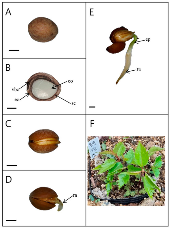 Germination and seedling development of Prunus spachiana. Bars = 2 mm. (A) Seed external morphology; (B) longitudinal section of a seed; (C) an opened endocarp; (D) radicle emergence; (E) a radicle and an epicotyl; and (F) seedlings. ec, endocarp; sc, seed coat; co, cotyledons; vbs, vascular bundle canal; ra, radicle; and ep, epicotyl. In Figure 1F, the white label indicates a replication for investigation of seedling emergence.