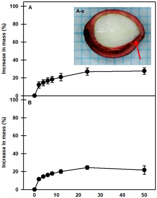 Water uptake by nonscarified seeds (A) and scarified seeds (B) of Prunus spachiana as represented by an increase in mass. Seeds were incubated at room temperature (20–25 °C) on filter paper with distilled water for 50 h. Seeds were soaked in Safranin O (1%) for 24 h and absorbed through the vascular bundle canal (A-a). The arrow shows that the dye has moved to the bottom of the seed interior. Vertical bars indicate the standard error of the means (n = 3).