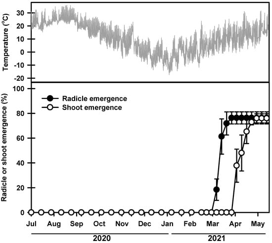 This experiment was performed to monitor radicle and shoot emergence from seeds exposed to seasonal temperature changes under natural conditions. Three replicates of 20 seeds were buried in a shaded area in the experimental garden of Andong National University, Korea (36°32′40.41888″ N, 128°48′2.67516″ E), on 2 July 2020. The soil temperature at a depth of 3 cm was monitored using a temperature data logger (3683WD1, Spectrum Technologies, Inc., Plainfield, IL, USA) every hour during the experiment. For radicle emergence, the seeds were wrapped in a plastic mesh filled with sand and buried to a depth of 3 cm in a plastic pot filled with horticultural substrate (Sunshine Mix #4; SunGro Horticulture, Agawam, MA, USA). This plastic pot was buried at the ground level. Three replicates were prepared, each with 20 seeds per pot. Once the emerged radicle reached a length of 1 mm, the seeds were regarded as germinated and immediately removed. For shoot emergence, the seeds were buried to a depth of 3 cm in a plastic pot filled with horticultural substrate. This plastic pot was buried at the ground level. Three replicates were prepared, each with 20 seeds per pot. The experiment lasted for 10 months, during which the emerged seedlings were counted and removed each week.