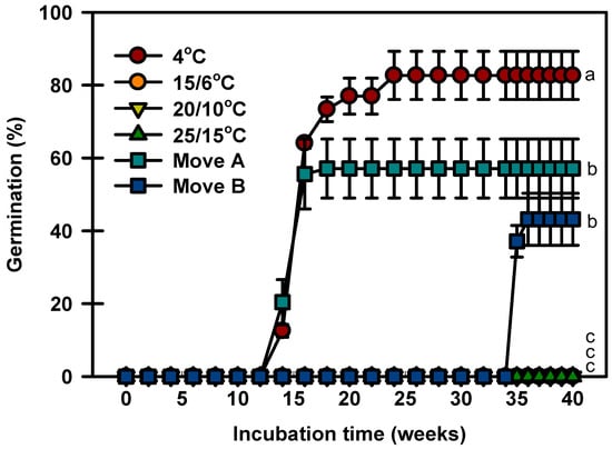 Seeds germinated to 82.6% at 4 °C after constant incubation, whereas no seeds germinated at 15/6, 20/10, or 25/15 °C at 40 weeks (Figure 4). In Move A, the seeds started to germinate after 14 weeks of incubation and quickly increased to 57.1% during incubation. In Move B, no seeds germinated until they were transferred to 4 °C. After being transferred to 15/6 °C, the germination of seeds reached 43.1% and did not increase further.
