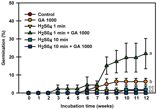 Germination of Prunus spachiana seeds treated with H2SO4 (0, 1, or 10 min) and GA3 (1000 mg·L−1). Error bars indicate the mean ± SE of three replications. Means with significant differences were compared using Duncan’s multiple-range tests at p ≤ 0.05.