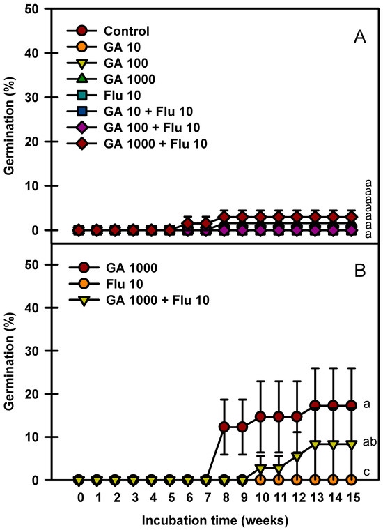 Germination of Prunus spachiana seeds treated with GA3 (0, 10, 100, and 1000 mg·L−1) and fluridone (10 mg·L−1). GA3 24 h soaking (A) and GA3 48 h soaking (B). Error bars indicate the mean ± SE of three replications. Means with significant differences were compared using Duncan’s multiple-range tests at p ≤ 0.05.