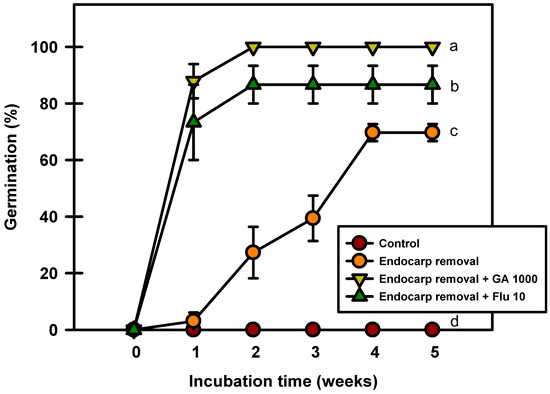 Germination of Prunus spachiana seeds after endocarp removal and 1000 mg·L−1 GA3 or 10 mg·L−1 fluridone soaking. Error bars indicate the mean ± SE of three replications. Means with significant differences were compared using Duncan’s multiple-range tests at p ≤ 0.05.