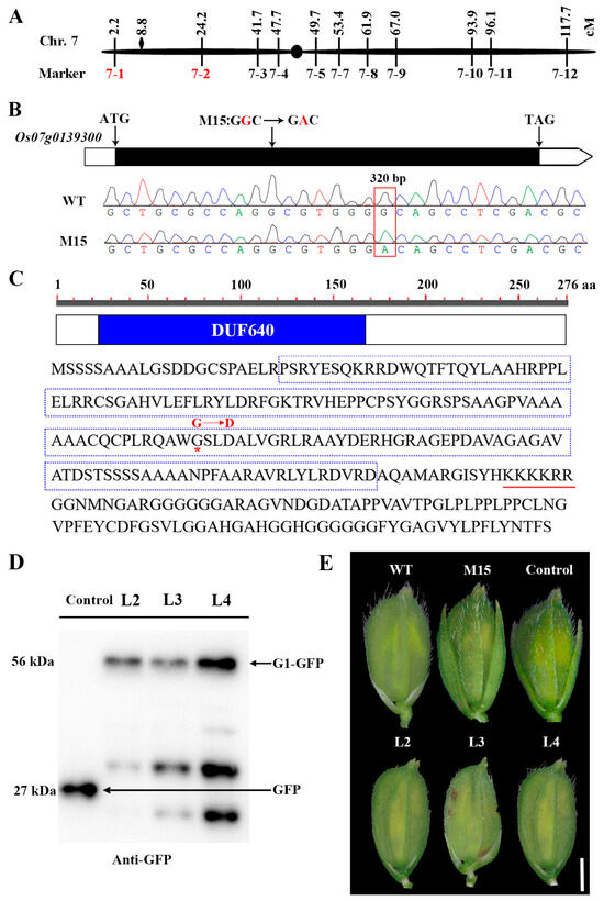 To identify the mutant locus controlling the long sterile lemma phenotype, M15 was crossed with the indica variety Dular to produce an F2 mapping population. Twenty long sterile lemma plants and twenty normal individual plants were selected in the F2 population to generate two DNA pools. Then, 170 polymorphic insertion–deletion (InDel) markers on rice 12 chromosomes were applied to genotype the two pools for preliminary mapping. The gene was mapped to chromosome 7 between InDel markers 7-1 and 7-2, with genetic distances of 2.2 cM and 24.2 cM, respectively (Figure 2A). It has been reported that the G1 gene regulates the development of glumes and is located at 8.8 cM of chromosome 7 [22], which is included in the markers of 7-1 and 7-2. Therefore, G1 (Os07g0139300) is preferred as a candidate gene. Gene sequencing showed that the G1 genomic sequences of M15 carried a single nucleotide substitution of guanine (G) to adenine (A) compared with the WT, leading to a non-synonymous mutation from glycine (G) to aspartic acid (D) at the 107th amino acid (Figure 2B,C). The G1 gene contains only one exon and encodes a protein composed of 276 amino acid residues that harbors a DUF640 domain in the middle terminus (Figure 2C).
