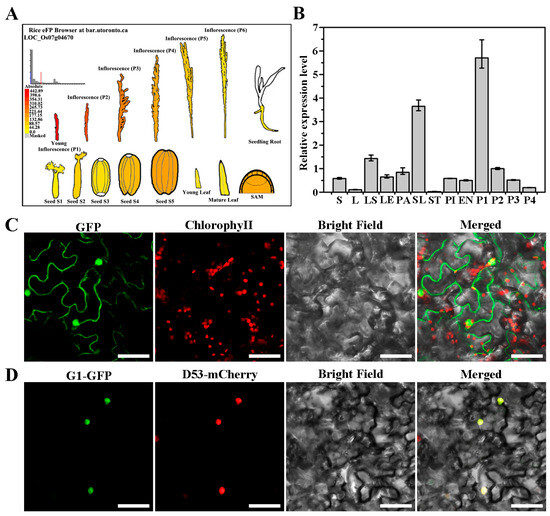 Spatiotemporal expression of G1 and subcellular localization of G1. (A) Expression patterns of G1 based on the rice eFP browser. (B) qRT-PCR analysis of G1 expression in various tissues. (C) Transient expression of free GFP in N. benthamiana leaves. (D) Transient expression of G1-GFP in N. benthamiana leaves. G1-GFP protein is located in the nuclei, overlapping with the nucleus marker D53-mCherry. GFP (green), chlorophyll autofluorescence (red) (C), mCherry (red) (D), bright-field images, and an overlay of green and red signals are shown. S: stem; L: leaf; LS: leaf sheath; LE: lemma, PA: palea, SL: sterile lemma, ST: stamen, PI: pistil. These tissues are taken from wild type plants just undergoing heading. EN: endosperm at 9 days after flowering, P1: 0.5~2 cm panicles, P2: 3~5 cm panicles, P3: 6 cm panicles, P4: panicles before heading. Data represent means and standard errors of three replicates. Scale bars = 50 μm (C,D).