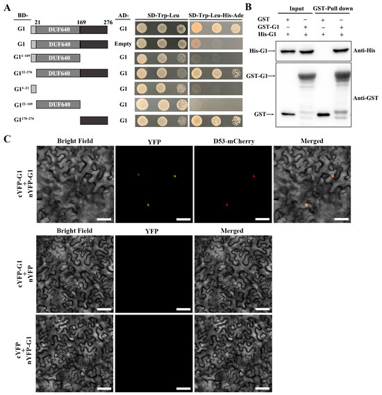 G1 forms a homocomplex. (A) Yeast two-hybrid assay showing the interaction between G1 and itself. (B) Pull-down assay showing the direct interaction between GST-G1 and His-G1 in vitro. (C) BiFC assay showing that G1 interacts with G1 in N. benthamiana leaf cells. Scale bars = 50 μm.