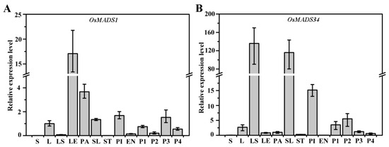 Expression patterns of OsMADS1 and OsMADS34 in rice. (A,B) Gene expression levels of OsMADS1 (A) and OsMADS34 (B) in various rice tissues. S: stem; L: leaf; LS: leaf sheath; LE: lemma, PA: palea, SL: sterile lemma, ST: stamen, PI: pistil. These tissues are taken from wild-type plants just undergoing heading. EN: endosperm at 9 days after flowering, P1: 0.5~2 cm panicles, P2: 3~5 cm panicles, P3: 6 cm panicles, P4: panicles before heading. Data represent means and standard errors (from at least three independent replicates).