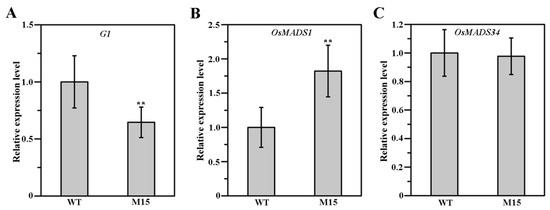 Expression levels of G1 (A), OsMADS1 (B) and OsMADS34 (C) in the sterile lemmas of WT and M15. Data represent means and standard errors (from at least three independent replicates). Data were analyzed using a t-test; ** showed extremely significant difference (p < 0.01).