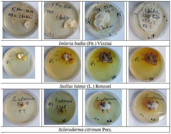 Similar results, except for the genus Lactarius, were also obtained in similar studies []. The species Rhizopogon luteolus, Hygrophorus hypothejus, Hebeloma crustuliniforme, H. mesophaeum, Paxillus involutus, Scleroderma aurantium, S. verucosum, and Boletus edulis were characterized by relatively simple isolation and good development in pure cultures []. In the studies by Espenshade [], the success rate for obtaining pure cultures on an agar medium was only 20%, and in the studies by Oddoux, it was 48% []. In the studies by Mynakov et al. [], the success rate for the recovery of S. luteus isolates was 20%, and for S. bovines, it was 15%. Similar studies were also carried out by other scientists [,]. The difficulty of growing species in pure cultures encourages the investigation of clear requirements for the growth and survival of isolates.
