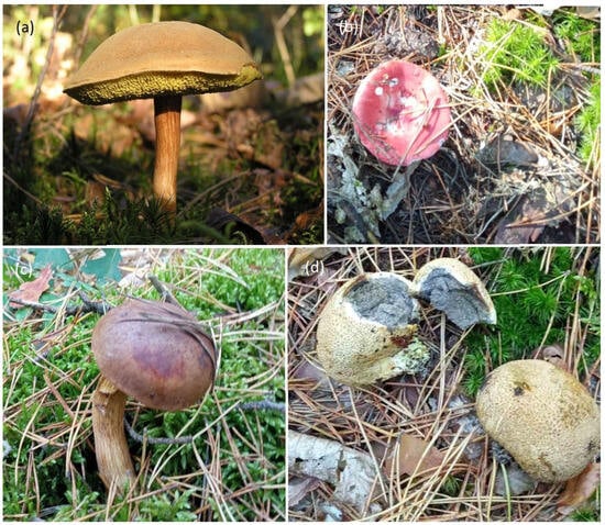 Selected examples of mycorrhizal fungi in a pine forest: fruiting bodies of Xerocomus subtomentosus (a), Russula paludosa (b), Imleria badia (c), and Scleroderma citrinum (d) in the litter of a pine forest (photo V.D.).