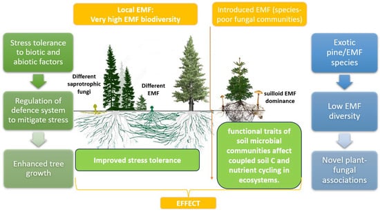 - Hoeksema, J.D.; Averill, C.; Bhatnagar, J.M.; Brzostek, E.; Buscardo, E.; Chen, K.H.; Liao, H.L.; Nagy, L.; Policelli, N.; Ridgeway, J.; et al. Ectomycorrhizal plant-fungal co-invasions as natural experiments for connecting plant and fungal traits to their ecosystem consequences. Front. For. Glob. Chang. 2020, 3, 84. [Google Scholar] [CrossRef]