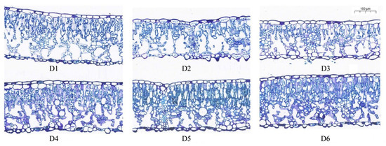 Cross-sectional microstructure of L. chinense leaves. D1 to D6 represent samples with different planting densities: D1, 1 m × 1 m (10,000 plants per hectare); D2, 2 m × 2 m (2500 plants per hectare); D3, 3 m × 3 m (1111 plants per hectare); D4, 4 m × 4 m (625 plants per hectare); D5, 5 m × 5 m (400 plants per hectare); D6, 6 m × 6 m (277 plants per hectare).