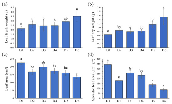 Differences in leaf traits of L. chinense under different forest stand densities. (a) leaf fresh weight; (b) leaf dry weight; (c) leaf area; (d) specific leaf area. Lowercase letters represent significant differences (p < 0.05) between samples.