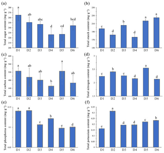 Differences in nutrient content of L. chinense under different forest stand densities. (a) total sugar content; (b) total starch content; (c) total carbon content; (d) total nitrogen content; (e) total phosphorus content; (f) total potassium content. Lowercase letters represent significant differences (p < 0.05) between samples.