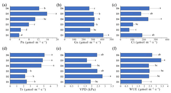 Differences in the photosynthetic parameters of L. chinense under different forest stand densities. (a) instantaneous net photosynthetic rate (Pn); (b) stomatal conductance (Gs); (c) intercellular CO2 concentration (Ci); (d) transpiration rate (Tr); (e) vapor-pressure deficit (VPD); (f) water utilization efficiency (WUE). Lowercase letters represent significant differences (p < 0.05) between samples.