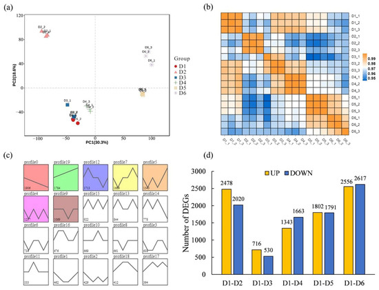 Gene expression in L. chinense under different forest stand densities. (a,b) principal component analysis and cluster analysis of gene expression; (c) short time-series expression miner (STEM) analysis of gene expression; (d) gene differential expression analysis using D1 sample as control.
