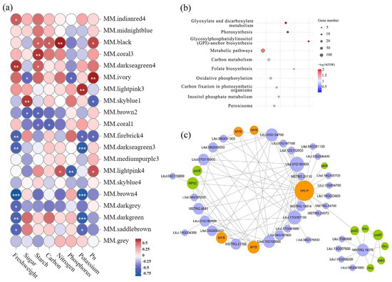 Construction of a co-expression network for photosynthesis-related genes. (a) Correlation analysis between module eigenvalues and photosynthetic related traits. The red circles represent positive correlation, while the blue circles represent negative correlation. The star represents a significant correlation (*: p < 0.05, **: p < 0.01; ***: p < 0.001). (b) KEGG enrichment analysis of genes within the black module. (c) Analyses of the Co-expression network. The green circles represent photosynthesis-related genes, while the orange circles represent transcription factor coding genes.