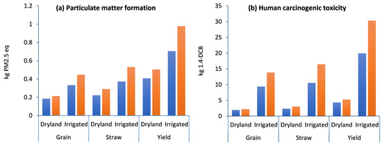 Particulate matter (PM) is one of the major environmental pollutants and has negative effects on human health [40]. Several studies have shown that these practices affect the ecosystem and have impacts on human health [41,42,43]. The results of this research show that the PMFP in irrigated farming was higher than in dryland, and in both strategies, compost application reduced the PMEP by 23.77% and 38.72% in dryland and irrigated farming, respectively (Figure 4a). Based on the displayed results in Table 2, the share of chemical fertilizers in the compost strategy in both dryland and irrigated farming was lower than without compost strategies. Therefore, it can be a reason for the significant reduction in PMEP. On the other hand, irrigated farming relies on irrigation pumps normally powered by fossil fuels or electricity, while dryland farming relies on precipitation, resulting in lower energy consumption in this system than in irrigated farming. Also, a closer look at Table 2 shows a lower share of fossil fuel in dryland than in irrigated farming, resulting in lower emissions of air pollutants including particulates finer than 2.5 μm.