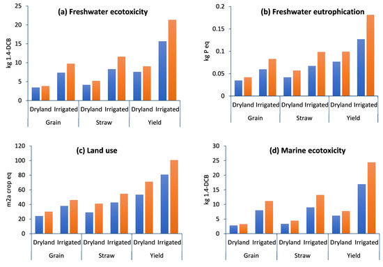 Midpoint ecosystem quality impact assessment of grain, straw, and total yield (ton ha−1) in dryland and irrigated wheat farming with compost (blue color) and without compost (orange color).