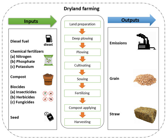 The goal and scope are the first phase of any LCA research and consist of the functional unit, system boundary, and study aim. As a comparative condition, the functional unit is connected to the inputs and outputs. Several operations are required for wheat cultivation, i.e., land preparation, deep plowing, plowing, cultivation, sowing, fertilizing, compost application, irrigation, and harvesting. One tone of dry matter was considered as the functional unit for this research. Also, the system boundary of cradle-to-farm gate was considered in this research, (Figure 10). The emissions and nutrient losses were evaluated based on the following terms: carbon dioxide (CO2), nitrous oxide (N2O), nitrates (NO3), nitric oxide (NO), nitrogen dioxide (NO2), ammonia (NH3), nitrogen (N), phosphates (PO4), and phosphorus (P).