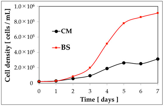 The cell density of E. gracilis cultured in BS medium under white fluorescent light (90 µmol photons/m²/s, 30 °C) conditions reached more than four times that of cells cultured in CM medium on the seventh day (Figure 1). Moreover, in an experiment where growth was allowed until the stationary phase (Figure S1), the cell density in BS was more than five times that in CM on the eighth day, and the cell densities were comparable at the stationary phase, indicating that BS has a higher initial growth rate compared to CM. This indicates that the composition of the BS medium is conducive to the growth of E. gracilis. As the cell suspension is composed of the functional food BS and E. gracilis, it is considered to have a high nutritional value.