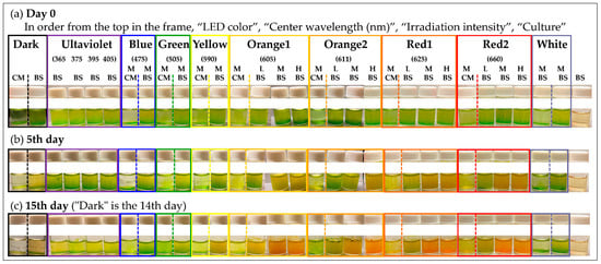 During the 7-day cultivation, a four-fold higher cell proliferation rate and cell density were observed in BS medium compared to CM medium (Figure 1). Subsequently, the progress of cultivation over 15 days was observed under the conditions specified in Table 2 (Figure 2). On the 15th day, reddening of the culture medium was observed in samples exposed to warm-wavelength lights “Orange1 (605 nm) to Red2 (660 nm)” with a high amount of irradiation light (“M”, “H”). Additionally, while the BS medium exhibited an orange hue, the CM medium showed green to yellow colors.