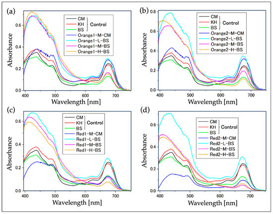 From Figure 3, samples in CM medium that exhibited a notable yellow color (Red1-M-CM, Red2-M-CM) were characterized by a decrease in the absorption peak of Chl-a (680 nm) and a flatter broad absorption peak of carotenoids (430~500 nm) compared to the control CM spectrum. In contrast, samples in BS medium showing significant reddening (samples with light amounts of M and H under various LEDs) had a significantly larger absorption peak of carotenoids (430~500 nm) compared to the absorption peak of Chl-a (680 nm). Furthermore, the absorption peak of carotenoids became larger towards shorter wavelengths, forming an ascending shoulder shape.