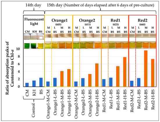 Regarding the above, from Figure 4, the ratio of absorption peak intensities in the cell suspension (“Carotenoid/Chl-a” in Figure 3) in the reddened cell suspensions was around 4~10, and there was a tendency for this value to increase with the irradiation of longer wavelength LED light. On the other hand, in other samples that did not show significant reddening, this ratio was around 2.