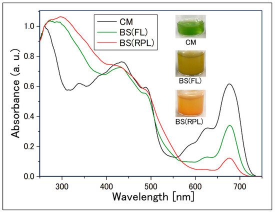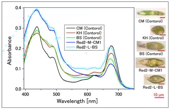 From Figure 3, it was observed that the spectrum of the reddened cell suspensions (culture medium “BS”, light amount “M” or “H”) exhibited a markedly smaller absorption peak of Chl-a (at 680 nm) relative to the carotenoid peak (around 420 nm).