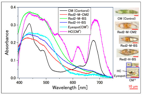 Absorption spectra of single cells (Figure 1). HC: Haematochrome-like granules. The control sample (CM) was from a separate set of experiments (see the section “Cultivation of Control Sample”) and not part of the series of experiments (Figure 2, Table 2). Symbols for other samples correspond to Figure 2, Table 2. CM * (HC, Eyespot) data has been re-edited from our previously published article [23] (photograph at the bottom). Because the photos were taken in dark conditions, the images (other than CM*) have been corrected using the “auto-correction” function of the “Microsoft Office Picture Manager”.