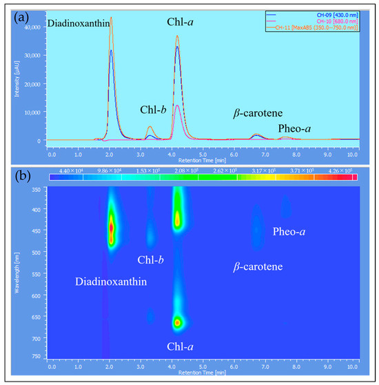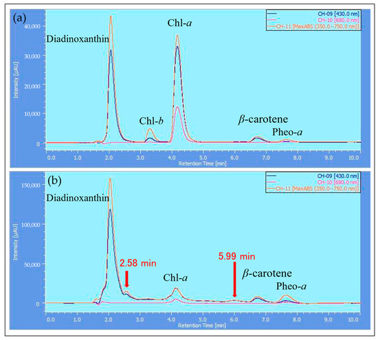 From Figure 8, it was observed that in the reddened cells, both Chl-a and Chl-b were significantly reduced. Also, in the reddened cells, peaks at 2.6 min and 6.0 min, which were not observed in cells grown in CM medium, were seen (Figure 8b). The peak that appeared at 2.6 min in the control was not present. The carotenoid peak at 6.0 min and the pheophytin a peak at 7.7 min increased.