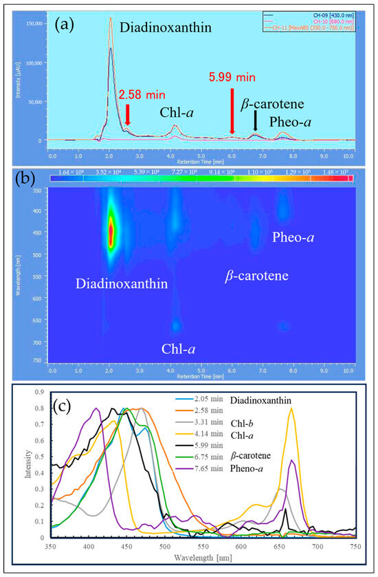 Next, we consider the HPLC analysis results of the red substance. In E. gracilis, the most abundant carotenoid is diadinoxanthin, a type of xanthophyll, which constitutes 86% of the total carotenoids in the cell [21]. From this, the largest peak appearing just past 2 min in Figure 8, Figure 9 and Figure 10 is considered to be diadinoxanthin. Figure 8 reveals that in reddened cells, there was a significant decrease in Chl-a and Chl-b and an increase in pheophytin a. Additionally, new carotenoid peaks appeared at elution times of 2.58 and 5.99 min (Figure 10c). The peak at 2.58 min extended to around 550 nm on the long-wavelength side of the xanthophyll absorption spectrum, similar to the red pigment lycopene in tomatoes. The absence of the characteristic carotene absorption maxima (0-0, 1-0, 2-0) at this peak suggests it may be a xanthophyll with a C=O bond. The peak at 5.99 min, eluting after Chl-a, is presumed to be a carotene similar to β-carotene [51].