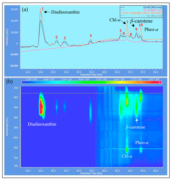 - Zapata, M.; Rodríguez, F.; Garrido, J.L. Separation of Chlorophylls and Carotenoids from Marine Phytoplankton: A New HPLC Method Using a Reversed Phase C8 Column and Pyridine-Containing Mobile Phases. Mar. Ecol. Prog. Ser. 2000, 195, 29–45. [Google Scholar] [CrossRef]