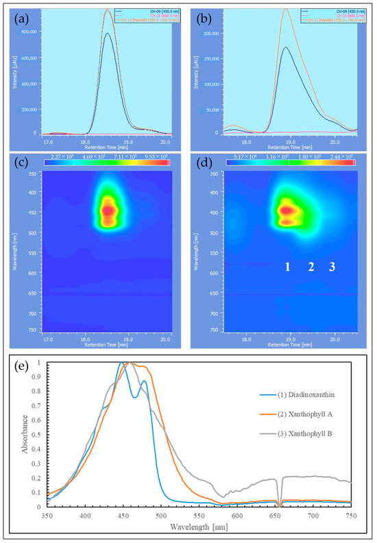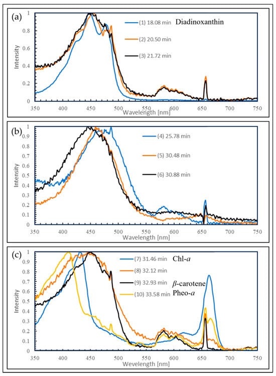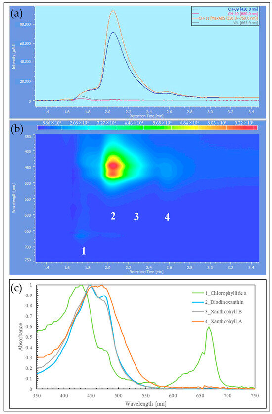 Considering that diadinoxanthin is the most abundant xanthophyll in E. gracilis [51], the largest peak appearing just after 2 min is thought to be diadinoxanthin. The peak at 2.6 min had a broad absorption spectrum of xanthophylls extending to around 550 nm, similar to the red carotenoid pigment lycopene in tomatoes. The peak at 2.6 min is presumed to be a xanthophyll with a C=O bond, as it lacked the characteristic absorption maxima (0-0, 1-0, 2-0) of carotenes. The peak at 6.0 min, eluting after chlorophyll a, is likely to be a carotene similar to β-carotene.