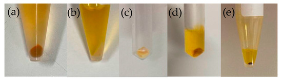 The results are shown in Figure 8b and Figure 10. Moreover, after the pigment extraction with MeOH, the yellow extract (supernatant of Figure 17b) was passed through a 0.22 µm filter, and after evaporating the solvent using an evaporator, 60 μL of 100% MeOH was added and concentrated, revealing a red precipitate (Figure 17e). This suggests that the red pigment was extracted in the yellow extract.