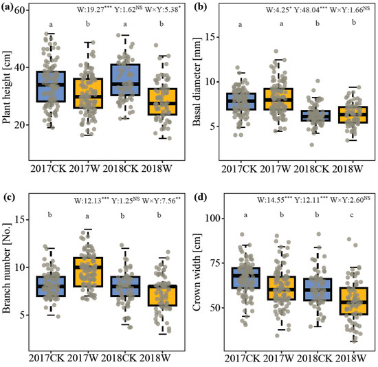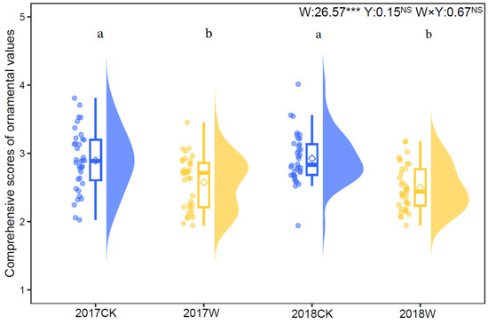 Figure 2. Raw data, boxplots and density of data points for comprehensive scores of ornamental values of I. oxyanthera under the control and warming treatment in 2017 and 2018. Diamonds indicate mean values. W, the effect of warming; Y, the effect of year; W × Y, the interaction effect of warming and year. Different lowercases represent a significant difference among the four experimental treatments. NS, no significance; ***, p < 0.001.