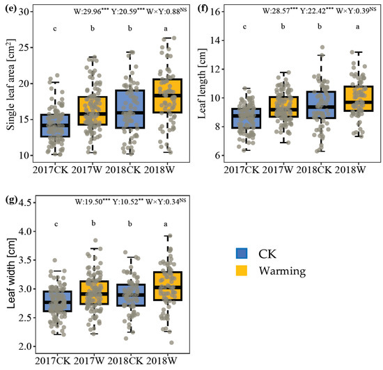 Figure 1. Effects of simulated warming (W: control and warming) and year (Y: 2017 and 2018) on plant morphology of I. oxyanthera. (a). Plant height, (b). Basal diameter, (c). Branch number, (d). Crown width, (e). Single leaf area. (f). Leaf length. (g). Leaf width. W, the effect of warming; Y, the effect of year; W × Y, the interaction effect of warming and year. Different lowercases represent a significant difference among the four experimental treatments. NS, no significance; *, p < 0.05; **, p < 0.01; ***, p < 0.001.