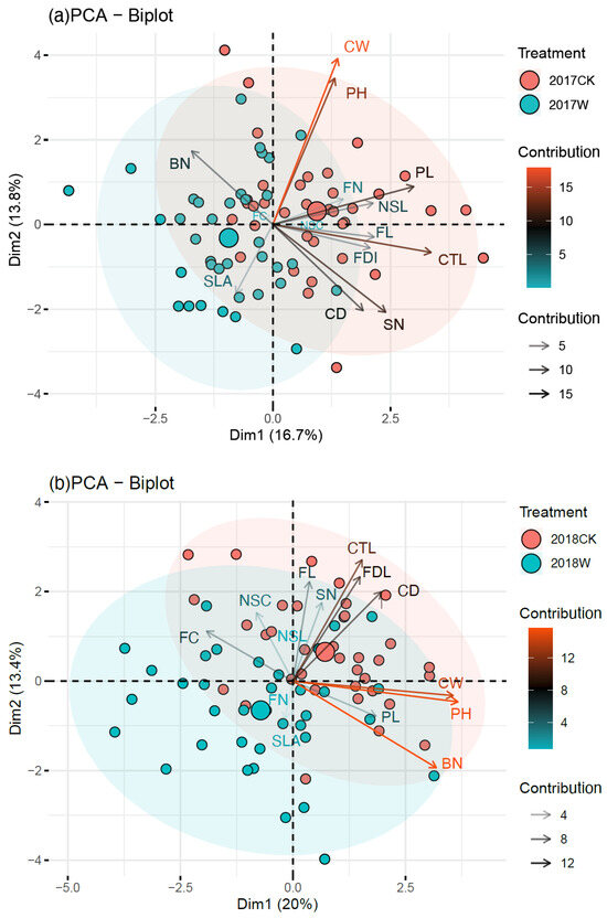 The results of the PCA showed that the variance interpretation rates of principal components 1 and 2 accounted for 16.70% and 13.80% of the total variance of all traits, respectively, with a total of 30.50% in 2017 (Figure 3a). The variance interpretation rates of principal components 1 and 2 were 20.00% and 13.40% of the total variance of all traits, respectively, with a total of 33.40% in 2018 (Figure 3b). In 2017, the first principal component was mainly composed of the corolla tube length (CTL), pedicel length (PL), stripe number on the labellum (SN), branch number (BN) and single-leaf area (SLA), which was positively correlated with CTL, PL and SN and negatively correlated with BN and SLA. The second principal component was highly correlated with the crown width (CW), plant height (PH), stripe number (SN), corolla diameter (CD) and other traits, which was positively correlated with CW and PH and negatively correlated with SN and CD (Figure 3a). In 2018, the first principal component was mainly correlated with the PH, CW, BN, floral color (FC), nectar spur curvature (NSC) and other traits, which was positively correlated with PH, CW, and BN and negatively correlated with FC and NSC. The second principal component was mainly composed of the CTL, FH, FL, BN, SLA and other traits. Among them, it was positively correlated with CTL, FH and FL and negatively correlated with BN and SLA (Figure 3b).