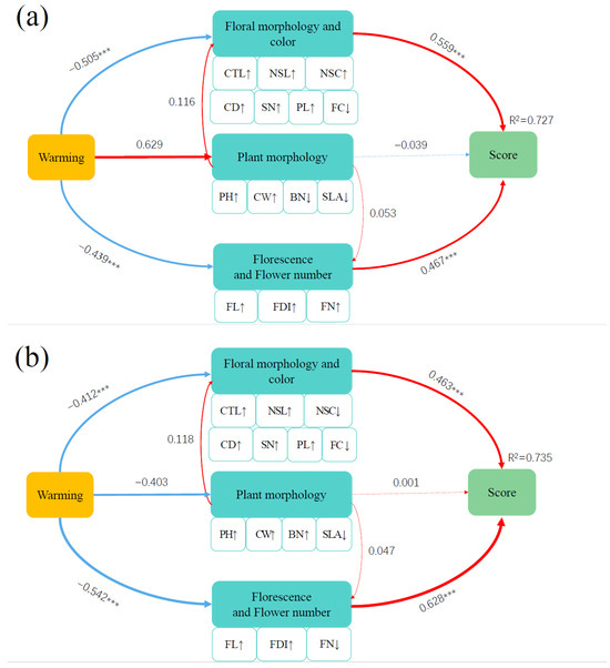 Figure 4. Partial least squares structural equation model (PLS-SEM) in 2017 (a) and in 2018 (b). Partial least squares structural equation model (PLS-SEM) depicting the effects of warming on comprehensive score of ornamental value of I. oxyanthera through direct effects on plant morphology, floral morphology and color and florescence and flower number. Single-headed arrows indicate the direction of a hypothetical causal relationship. Red and blue arrows indicate positive and negative relationships, respectively. Arrow width is proportional to the strength of the correlation. Double-layer rectangles represent the first component of PCA. The symbols ‘↑’ and ‘↓’ represent the positive and negative correlations between variables and the first component of PCA, respectively. R2 is the proportion of variance. The number next to the arrow is the standardized path coefficient. Significant path coefficients are marked with asterisks: ***, p < 0.001. No asterisks means no significance.
