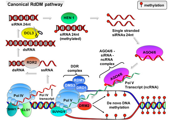 RdDM involves canonical and non-canonical pathways. These pathways are functionally similar but not identical. During the first stage of the canonical RdDM pathway, the plant specific RNA polymerase IV (Pol IV) complex is recruited to chromatin regions through its interaction with Sawadee homeodomain homolog1 (SHH1) and CLASSY family proteins (CLSYs) [30]. Next, Pol IV transcribes these regions producing short single-stranded RNAs (ssRNAs), which are then converted into double-stranded RNAs (dsRNAs) by the RNA-directed RNA polymerase 2 (RDR2) [31]. These dsRNAs are cleaved by the endoribonuclease enzyme DCL3 into 24-nucleotide small interfering RNAs (siRNAs) and are loaded onto Argonaute 4 (AGO4) or AGO6 proteins forming an AGO–siRNA duplex that enables AGO proteins to recognize and bind to RNA sequences complementary to the siRNA partner [32]. The second stage of this pathway involves the recruitment of Pol V to chromatin by DNA methyl readers SUVH2 and SUVH9 together with the DDR complex (consisting of DMS3, DRD1, and RDM1), leading to the synthesis of Pol V non-coding transcripts [33,34]. These RNA transcripts are used as “scaffolds” onto which the siRNAs loaded onto AGO4 or AGO6 bind forming an AGO–siRNA–ncRNA–Pol V ribonucleoprotein complex. The formation of this complex triggers the recruitment of the DNA methyltransferase domains rearranged methyltransferase 2 (DRM2), which is responsible for targeting the de novo methylation of nearby DNA at all sequence contexts resulting in transcriptional gene silence (Figure 2).