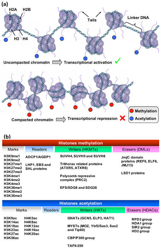 The structure of nucleosome core particle includes 146 DNA base pairs wrapped around a histone octamer, which consists of two copies from each of the four histone core proteins H2A, H2B, H3, and H4. Additionally, a histone protein, known as H1, binds to the nucleosome core and functions as a linker that stabilizes the structure [37]. These histone core proteins (H2A, H2B, H3, and H4) can be modified by epigenetic enzymes called “writers”, like histone lysine methyltransferases (HKMTs) and acetyltransferases (HATs), which add methyl and acetyl groups, respectively, at the N-terminal of their tails, leading to covalent modifications, i.e., methylation and acetylation [38]. In a similar manner, epigenetic enzymes, like histone demethylases (HDMs) and deacetylases (HDACs), act as “erasers” by removing methyl and acetyl groups, respectively, with the contribution of specific histone “readers” that can detect the position of modifications [39]. In V. vinifera, in silico analysis revealed the presence of 7 genes coding for HATs and 13 genes for HDACs. Of the seven HATs, two are part of the CBP family (HAC), one is part of the TAFII250 family (HAF), and four are part of the GNAT/MYST family (HAG). Ten out of the thirteen HDACs are members of the RPD3/HDA1 superfamily (HDA), two are members of the SIR2 family (SRT sequences), and one is a member of the HD2 family (HDT) [40]. HPTMs can regulate gene expression by changing chromatin structure, specifically influencing the tightness with which the nucleosomes bind to DNA and thereby shaping either a tight or loose chromatin state [41]. Different modifications can perform different functions, either promoting the packaging or the unpackaging of chromatin structure, leading to gene silencing or gene transcription, respectively (Figure 4). For instance, histone acetylation is associated with transcriptional activation, since the addition of acetyl groups to histone tails leads to weak binding of histones to DNA [42]. Histone methylation, on the other hand, can either activate or repress gene transcription, depending on the sites of methylation and the number of methyl groups added (me1, me2, me3) [39].