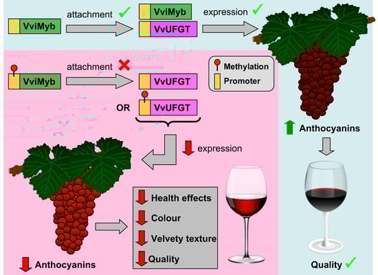 Effects of DNA methylation on anthocyanin content in grape berries and the resulting wine quality. Briefly, the binding of VViMyb transcription factors to the promoter region of VvUFGT, the key enzyme in anthocyanin biosynthesis, enhances its expression, resulting in elevated anthocyanin levels in grape berries. Conversely, methylation of either VviMyb or VvUFGT represses the expression of VvUFGT gene, resulting in poorly colored berries and diminished grape/wine quality.