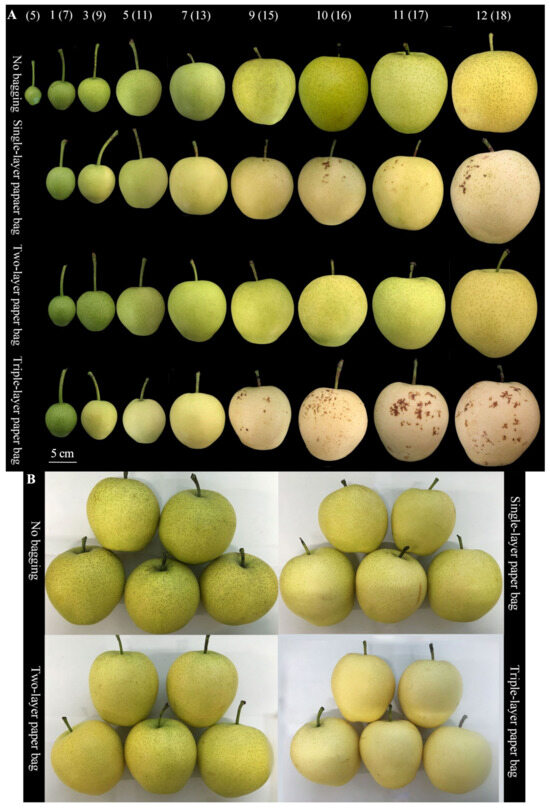 An essential practice for producing high-quality pears is bagging, a protective measure that helps to modify the peel color, improve the fruit’s smoothness, reduce lenticels, and optimize the peel’s tissue structure. This technique also goes beyond enhancing the fruit’s visual appearance by impacting the fruit’s firmness, soluble solid contents (SSCs), and volatile substance contents to varying degrees [1,2,3,4]. However, despite its advantages, bagging can be particularly challenging during the ripening season of Huangguan pears due to peel browning spots (commonly known as “chicken foot disease”), which are likely to occur on the surface of bagged pears. This browning process, which tends to occur rapidly, significantly undermines the commercial value of the fruit [5].