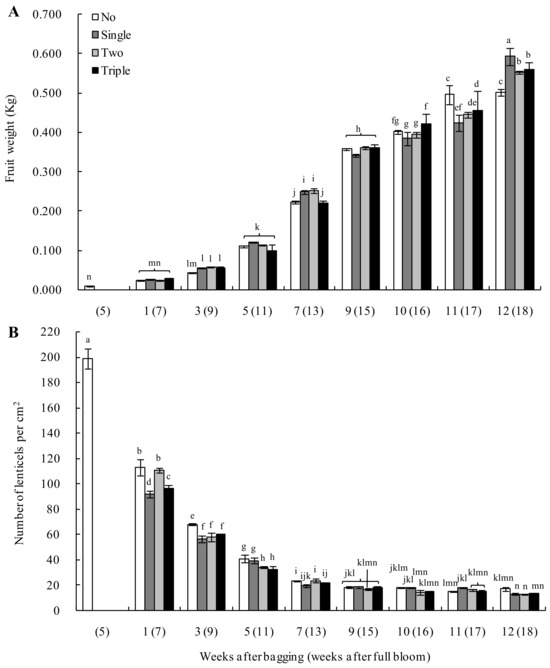 Effect of bagging on the fruit weight (A) and number of lenticels per cm2 (B) during development of ‘Huangguan’ pears. Different lowercase letters indicate significant differences (p < 0.05).