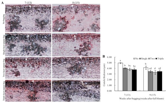 Based on the statistics, the cuticles’ thicknesses of different bagged fruits decreased during this period. Compared with the unbagged fruits, the cuticles’ thicknesses of the bagged fruits decreased significantly after seven to nine weeks of bagging. Although the cuticles’ thicknesses of single-, two-layer and triple-layer bagged fruit differed, the differences were not noticeable (Figure 4B).