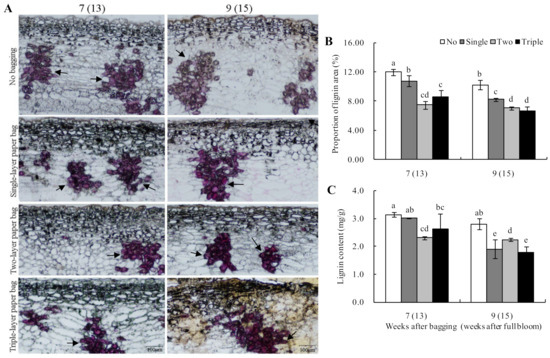 At the same time, lignin contents were measured, and after seven to nine weeks of bagging, a downward trend was noted for the different bagged groups. The lignin contents in the bagged groups were significantly lower than that of the unbagged fruits. At nine weeks (appearance of peel browning spots), the lignin contents of single- and triple-layer bagged fruits were the lowest (Figure 5C). Additionally, a significant correlation was noted between lignin distribution and content (r = 0.899, p < 0.01), indicating a consistent trend in lignin distribution and content.