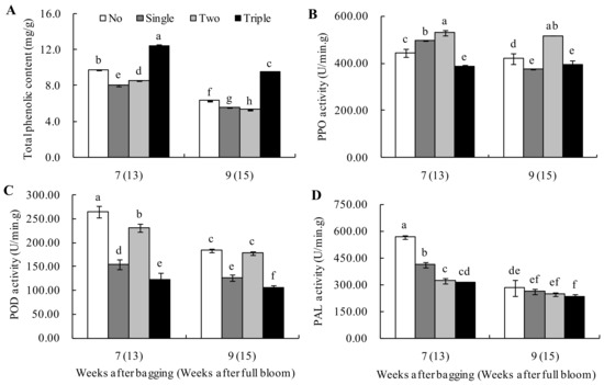 The total phenolic contents and activities of related enzymes in different bagged groups decreased after bagging for seven to nine weeks (Figure 6). The total phenolic contents in the peel of triple-layer bagged fruits were significantly higher than that of other bagged groups (Figure 6A). Furthermore, the unbagged and two-layer bagged fruits had substantially higher PPO and POD activities than those of single- and triple-layer bagged fruits. PPO and POD activities were the lowest in triple-layer bagged fruits, while for two-layer bagged fruits, the PPO activity was the highest (Figure 6B). In addition, the POD activity for unbagged fruits was the highest (Figure 6C). The PAL activity of the unbagged fruits was higher than that of the bagged groups and the activity of the triple-layer bagged fruits was significantly lower than that of the unbagged fruits (Figure 6D).